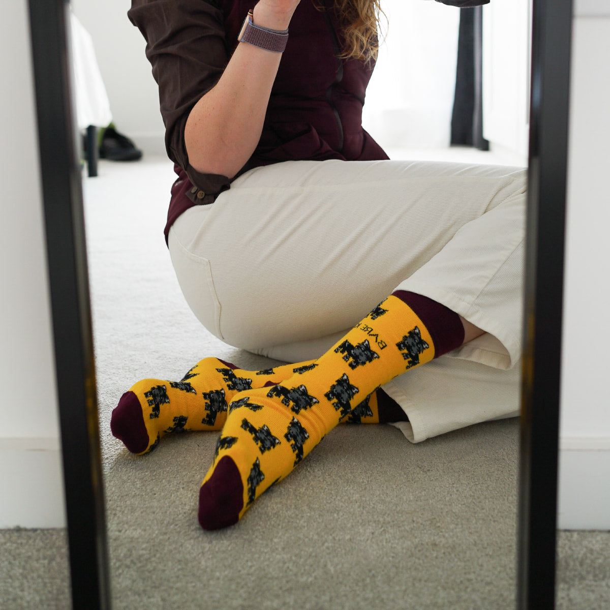 You can help protect our bearded friends, too! Be part of the royal movement by simply buying some Scottish dog socks. These are yellow socks with brown accents, featuring Scottie motifs all around.